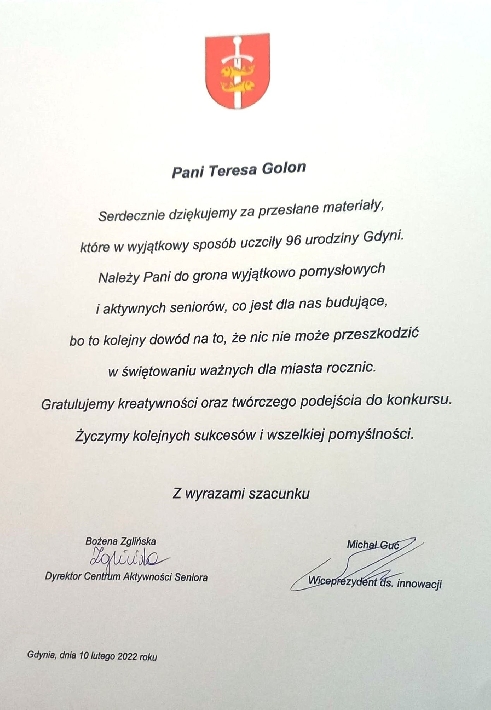 28 lutego 2022 r. w siedzibie Centrum Aktywności Seniora odbyło się wręczenie nagród i pamiątkowych dyplomów w związku z konkursem na przesłanie materiałów związanych z Gdynią. Wszyscy autorzy zostali zwycięzcami i z rąk dyrektor CAS - pani Bożeny Zglińskiej otrzymali nagrody i pamiątkowe dyplomy.