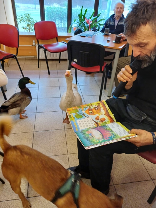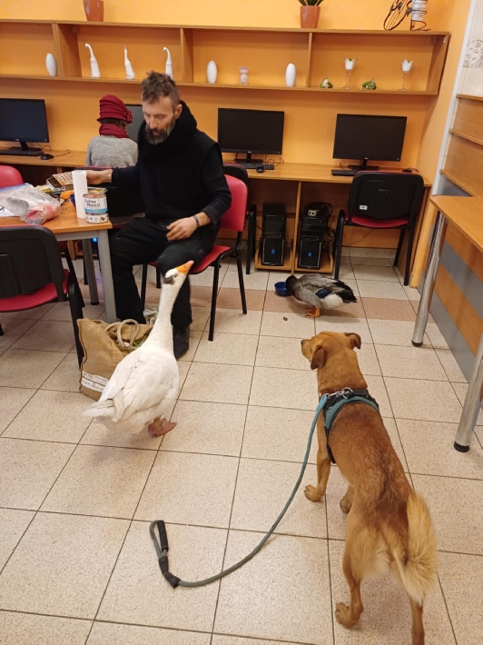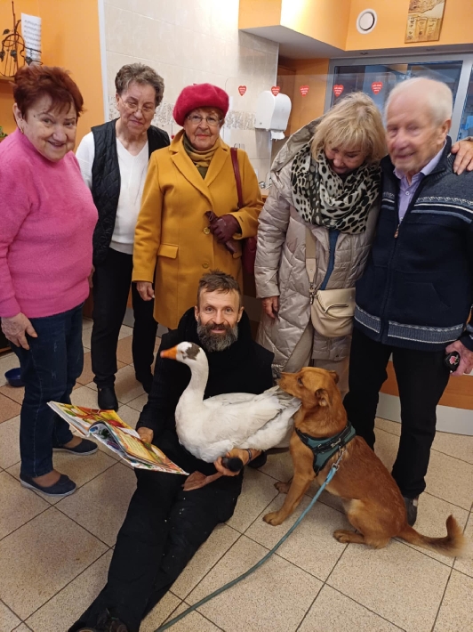 Podróżujący po całym kraju Dariusz Brzeski z gęsią Sunny, kaczorem Wirkiem i psem Kundeliniem odwiedził Centrum Aktywności Seniora w Gdyni. Takich gości w CAS jeszcze nie mieliśmy:) Choć styl życia Pana Dariusza może wydawać się nietypowy, z pewnością robi on dobre rzeczy i przypomina o tym, co ważne, uczy mieszkańców miast pielęgnowania relacji z naturą i pokazuje wartość relacji człowiek zwierzę.